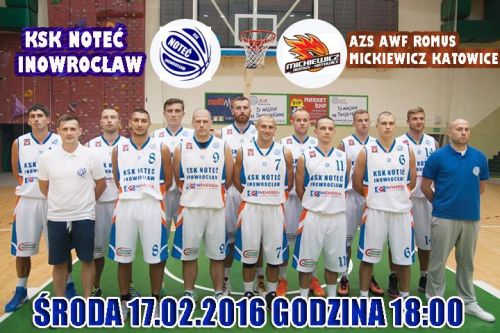 W środę (17.02.16) o godzinie 18 w Inowrocławskiej hali przy Niepodległości w ramach rozgrywek pierwszej ligi koszykarze KSK Noteć podejmować będą drużynę AZS AWF Mickiewicz Romus Katowice. Mogłoby się wydawać że o zwycięstwo będzie łatwo, nic bardziej mylnego. Zespół gości w ostatnich kolejkach spisuje się coraz lepiej. W ostatniej kolejce co prawda uległ wiceliderowi tabeli ale tylko 6 punktami a kolejkę wcześniej na wyjeździe pokonał Spójnie, drużna prowadzona przez trenera Adama Kubaszczyka odbiła się od dla tabeli. Już w najbliższą środę drużyna Noteci z pewnością powalczy o podtrzymanie dobrej passy zwycięstw na własnym parkiecie. Zapraszamy na to spotkanie.